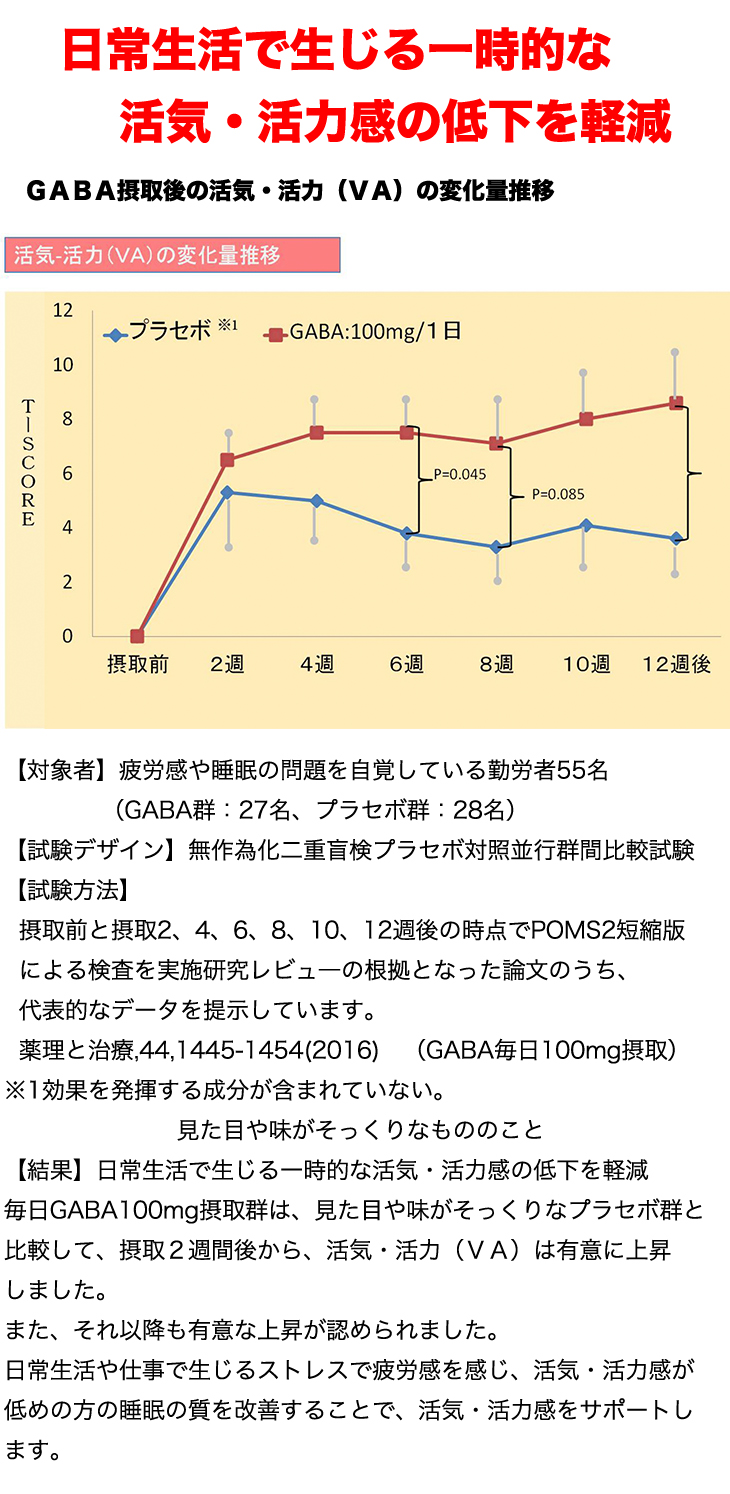 そのため、ベストパフォーマンスが求められるトップアスリートのストレス対策にも用いられているほど。近年では、ギャバ含有食品が多く登場し、一般生活者にとっても、日常的なストレスの軽減に役立っています。